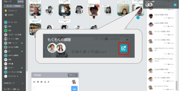 Remottyのテレビ会議機能を利用して会議をすると、タイムライン上部に会議中のユーザーが表示されるようになりました!これにより、「今、誰と誰が話をしている」という状態がリアルタイムでわかります。 ※画像赤枠ボタンから会議に参加することもで …